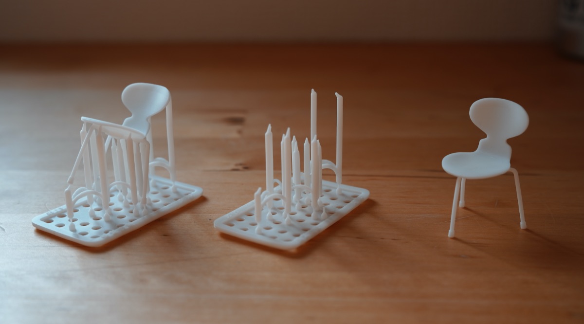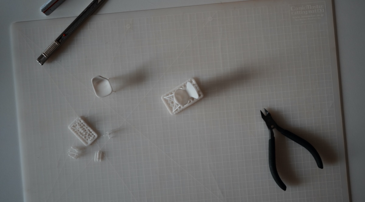 出力時に必要なサポート材は独自の設計で、ニッパー等でかんたんに切り離すことができるように本体との接合部を出来る限り細く仕上げています。輸送中に本体が破損しないよう、サポート材がついたままの状態で販売しています。